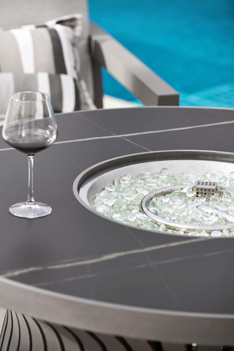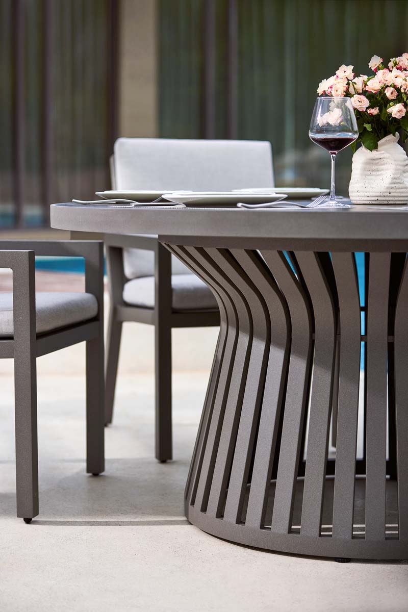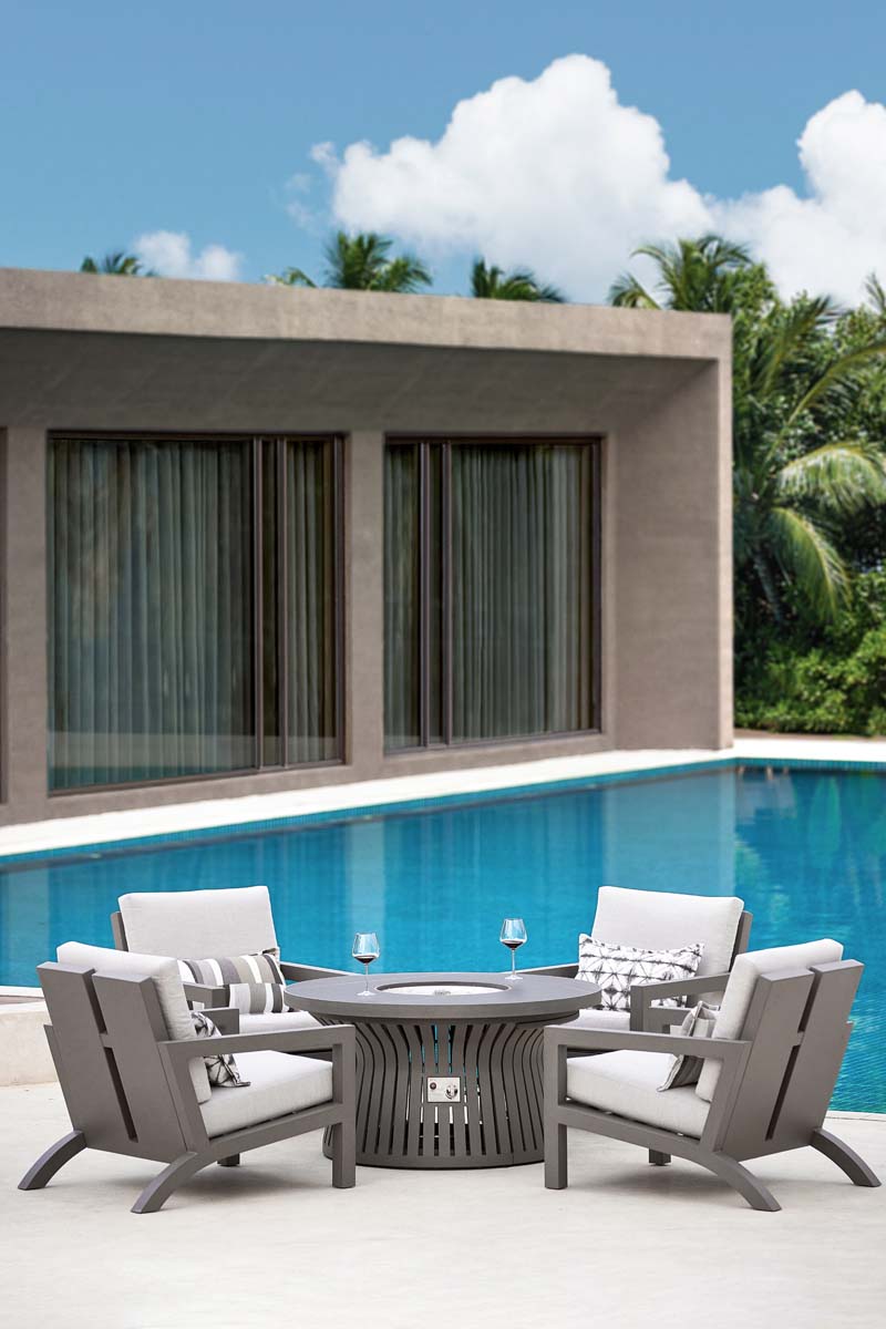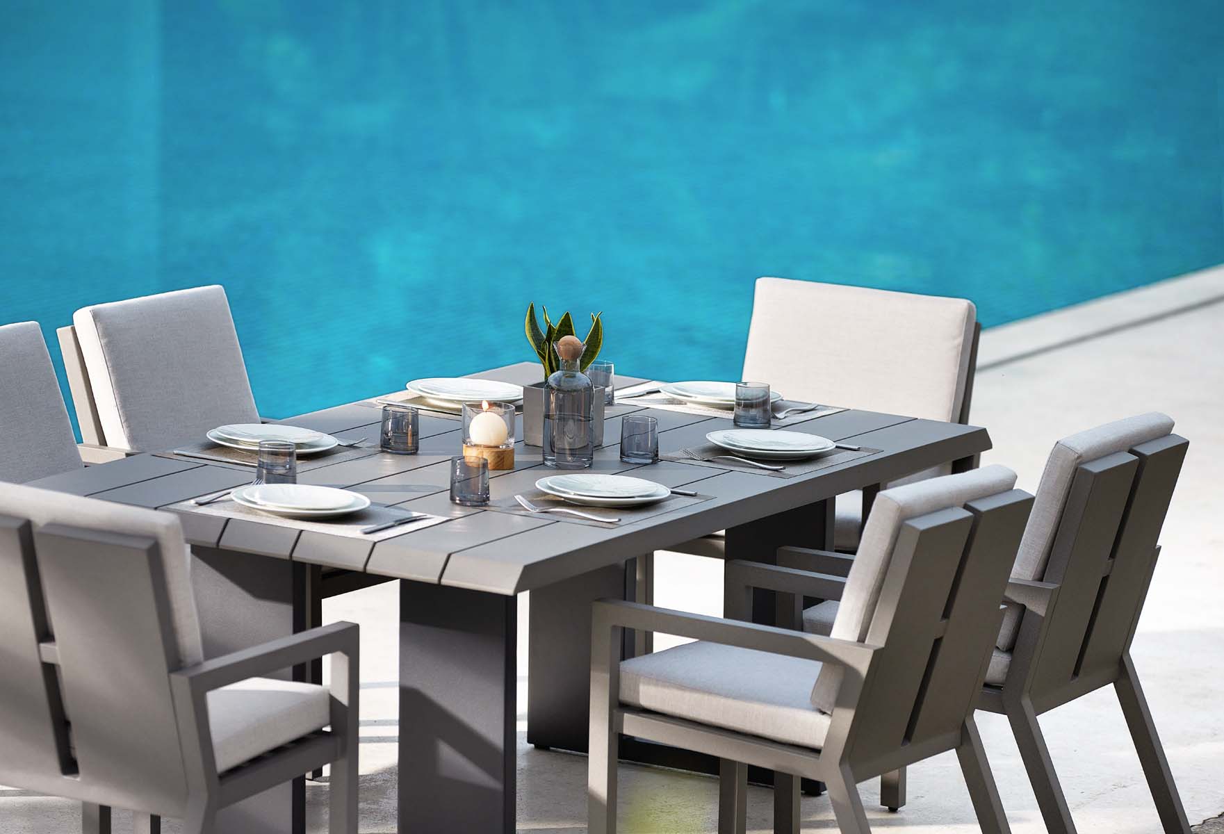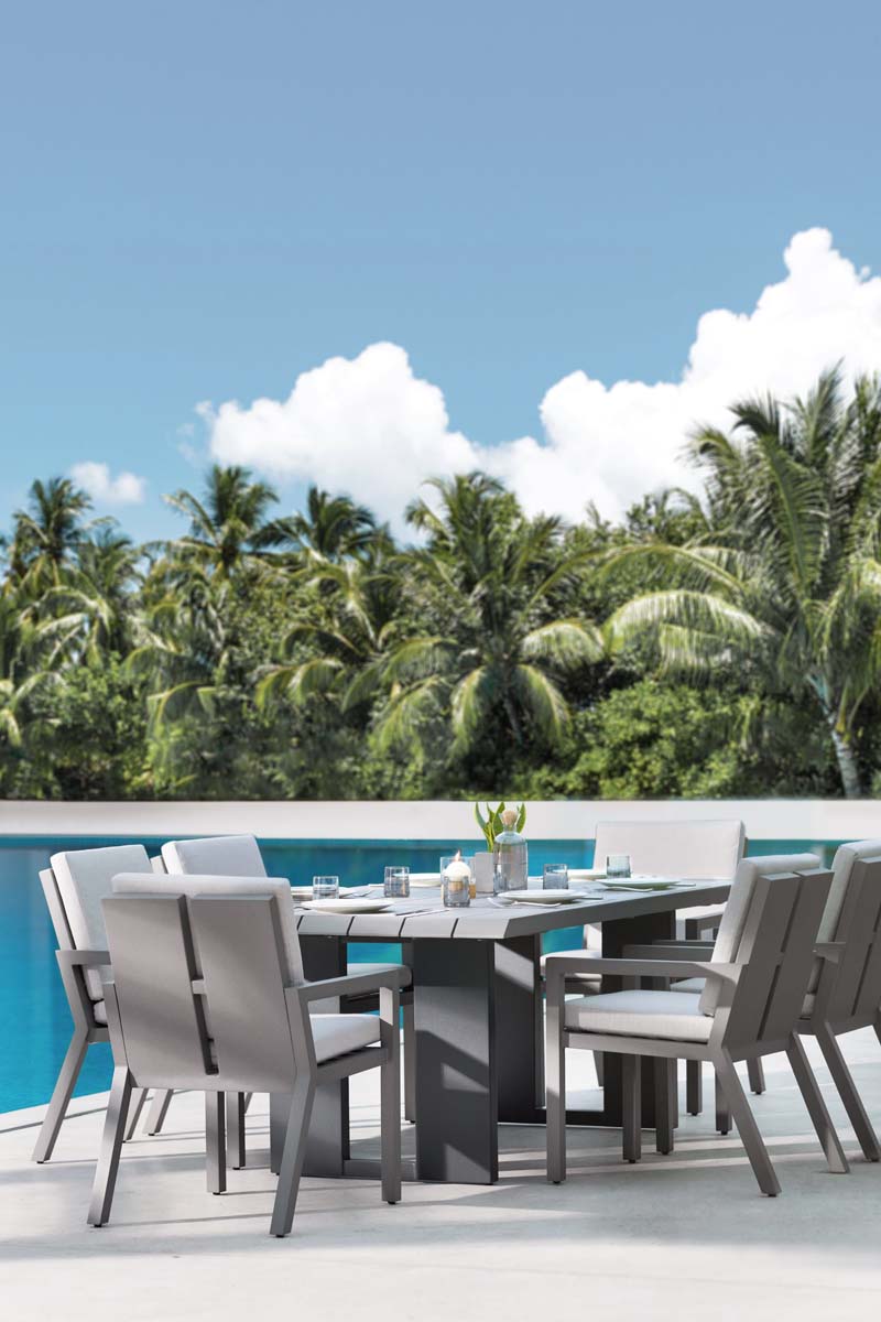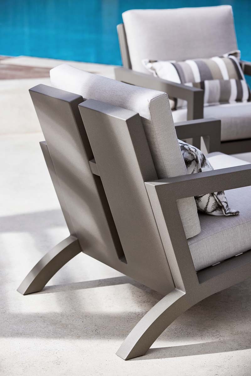 The Larkspur collection showcases elegant mid-century modern design with bold, architectural lines crafted from durable, rust-free aluminum.