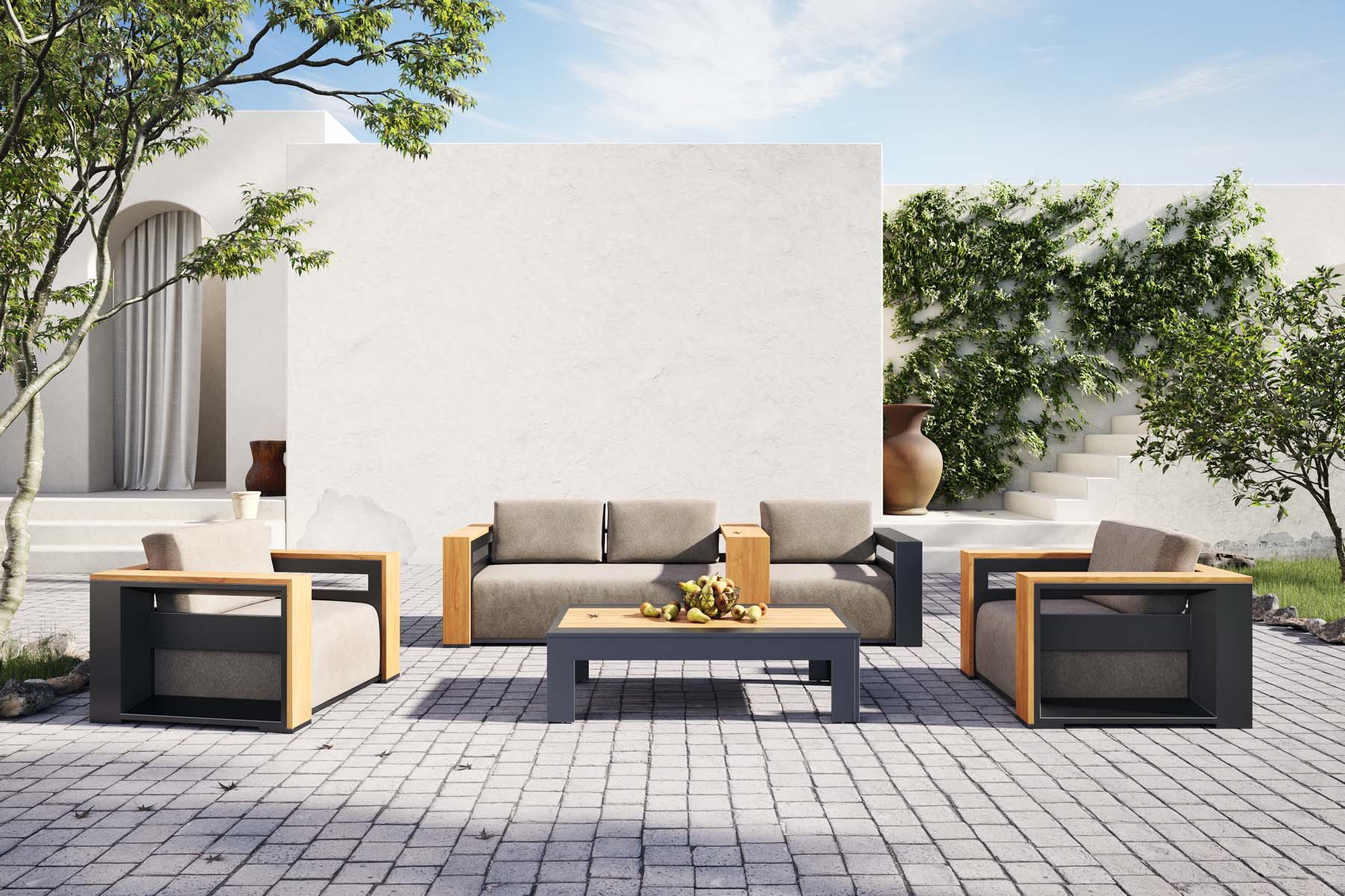 The Tahoe collection invites you to relax and connect in stylish, function, featuring a movable teak wood arm that doubles as a table this set is designed to help you unwind and enjoy your own corner of the great outdoors.